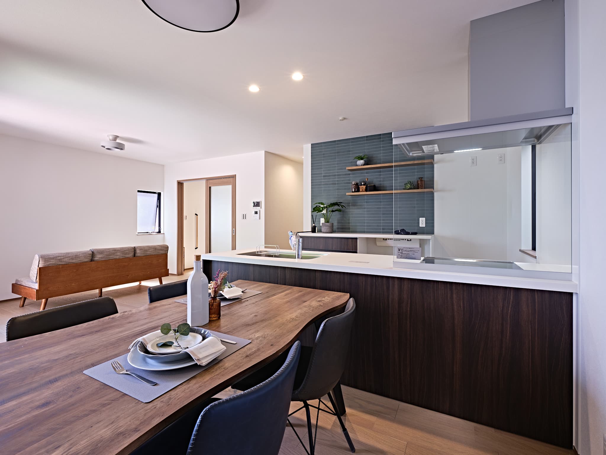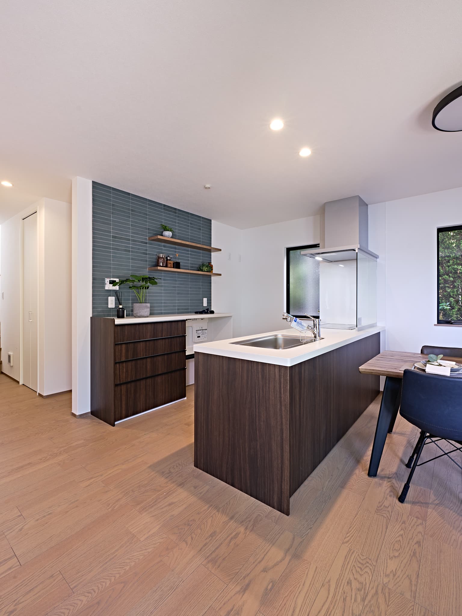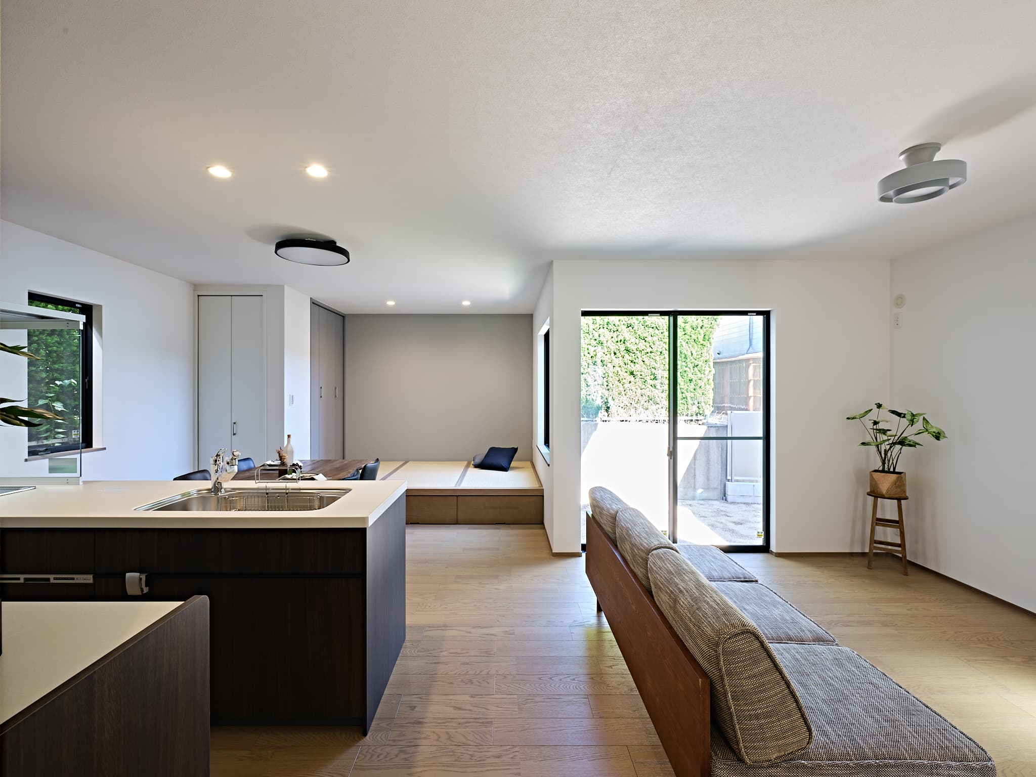1号地と同様に、敷地の形状を活かした設計で、自然の光と風を心地よく取り込む住空間に。窓の配置や空間のつながりに工夫を凝らし、視線と心地よい風が抜けることで視覚的にも、感覚的にも広がりを感じられる、快適な暮らしを実現しています。