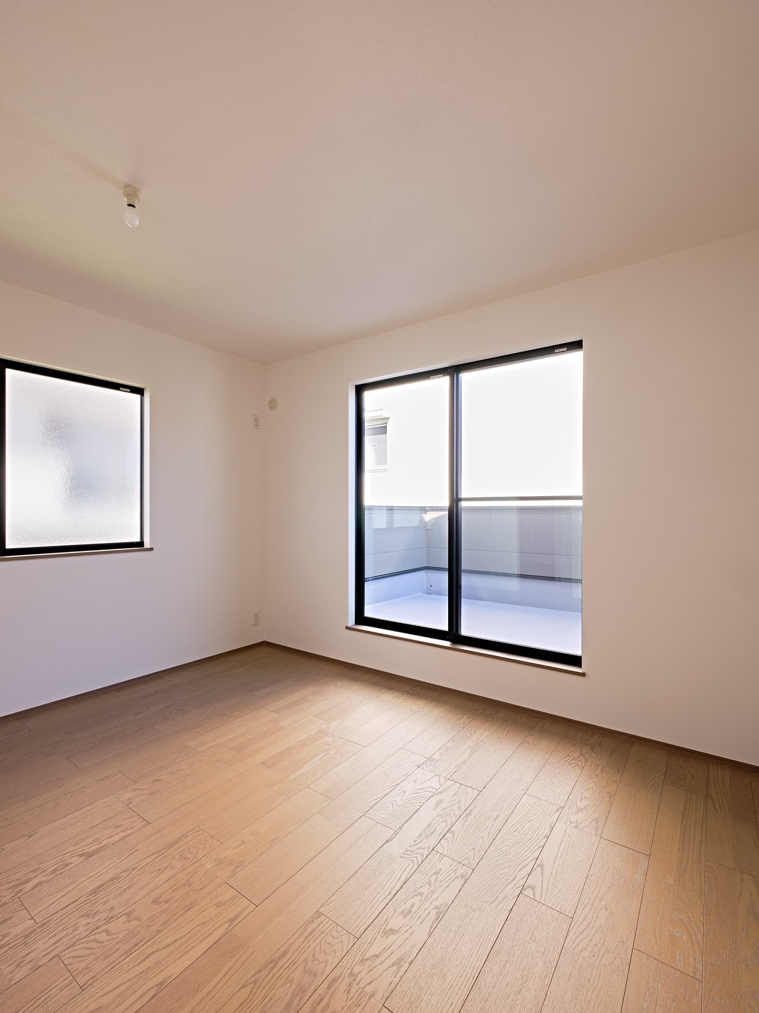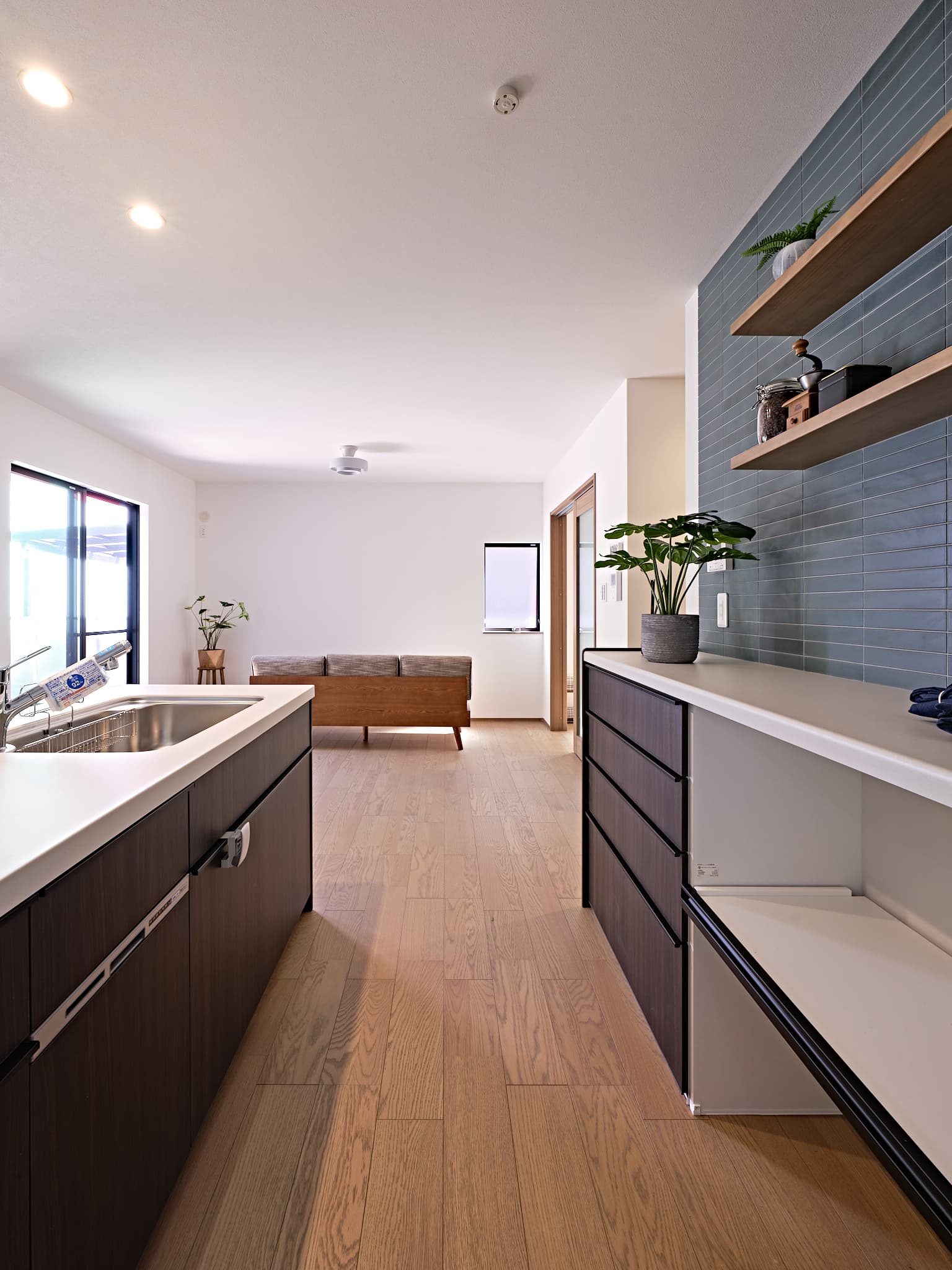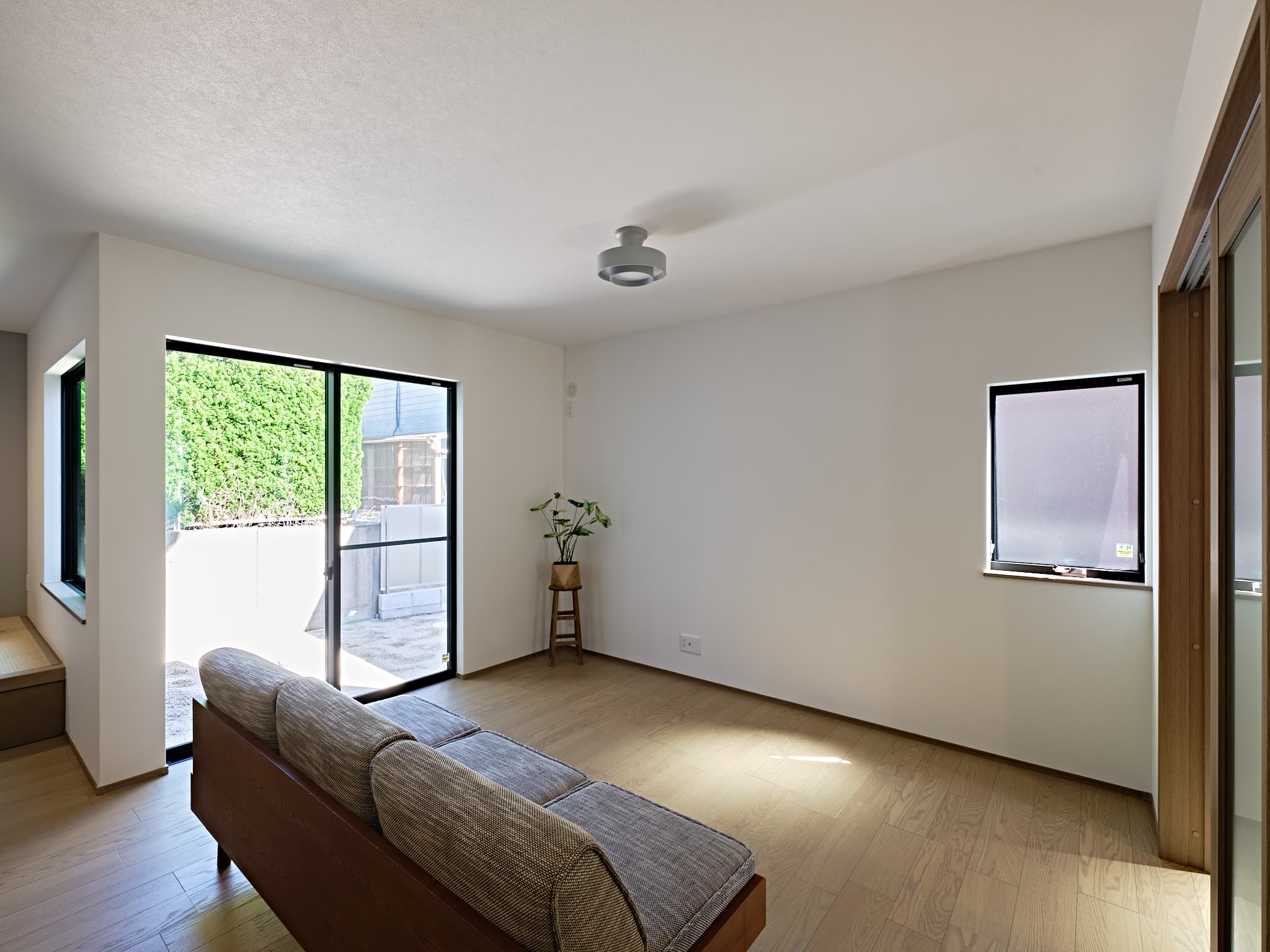 1号地と同様に、敷地の形状を活かした設計で、自然の光と風を心地よく取り込む住空間に。窓の配置や空間のつながりに工夫を凝らし、視線と心地よい風が抜けることで視覚的にも、感覚的にも広がりを感じられる、快適な暮らしを実現しています。