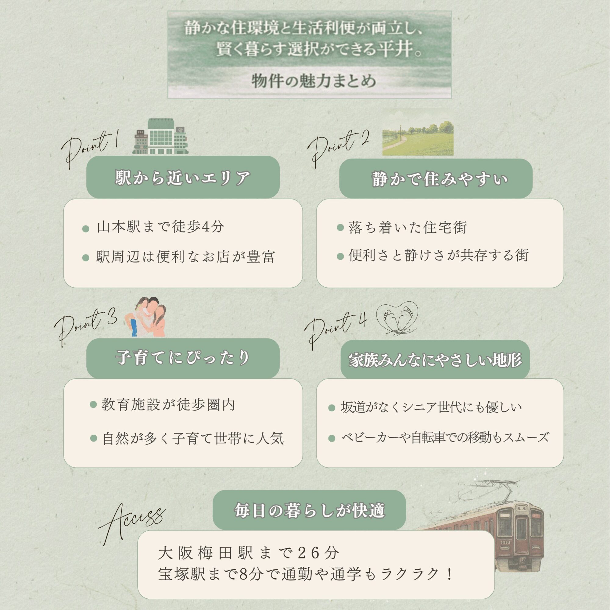 阪急「山本」駅まで徒歩4分。大阪梅田まで最短26分の軽快アクセス。